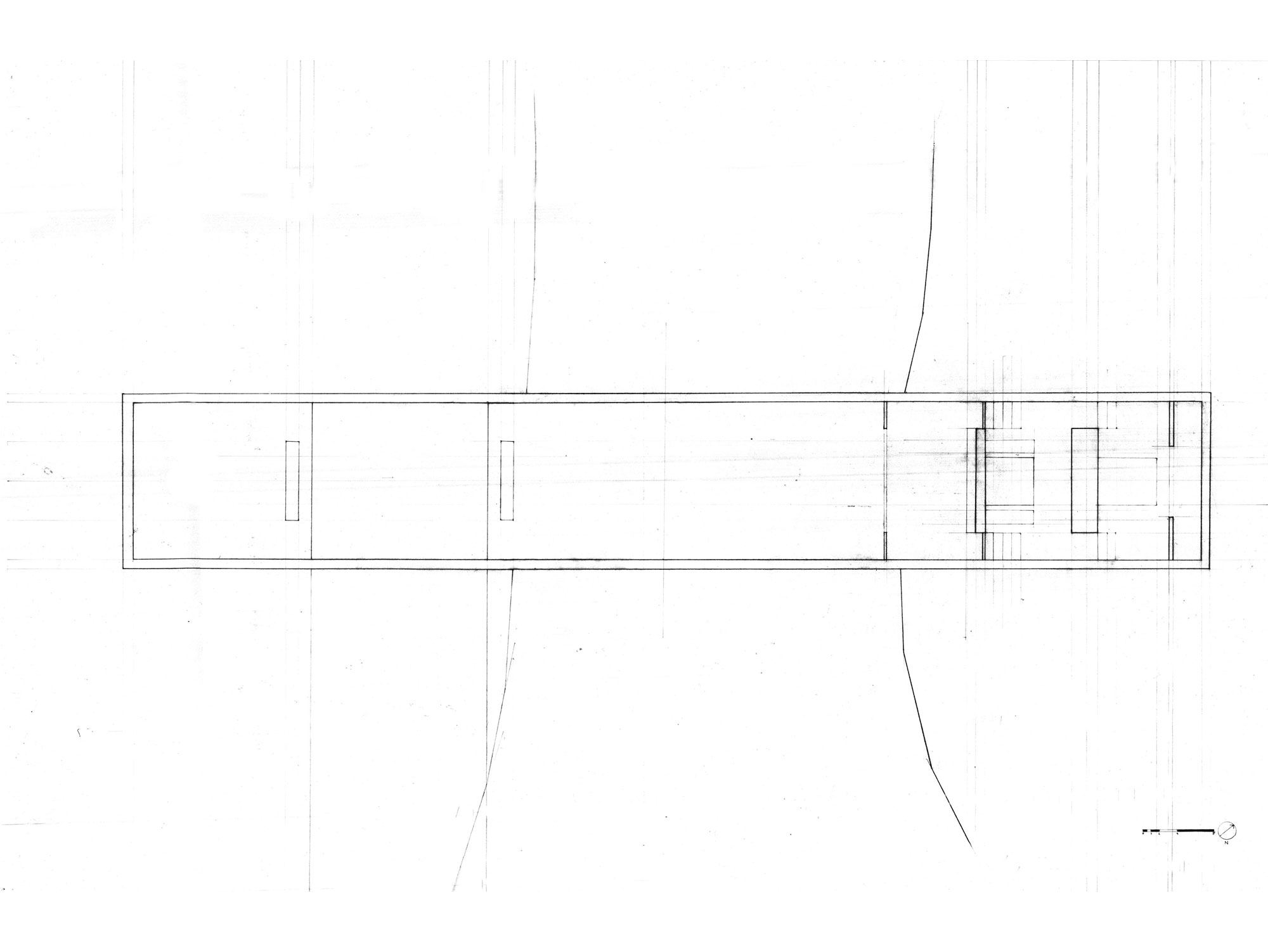 Hovering over the water, the inhabitant descends into a long hallway. Long slits create a sense of anticipation for the view at the end, facing the city of Ithaca across the lake.