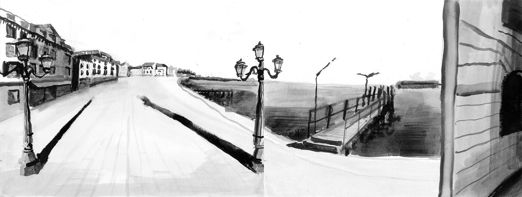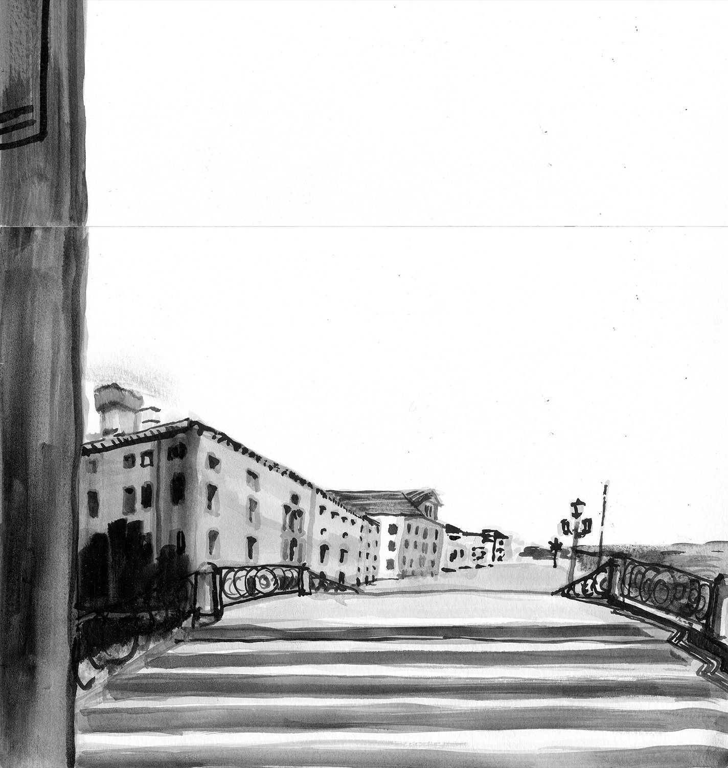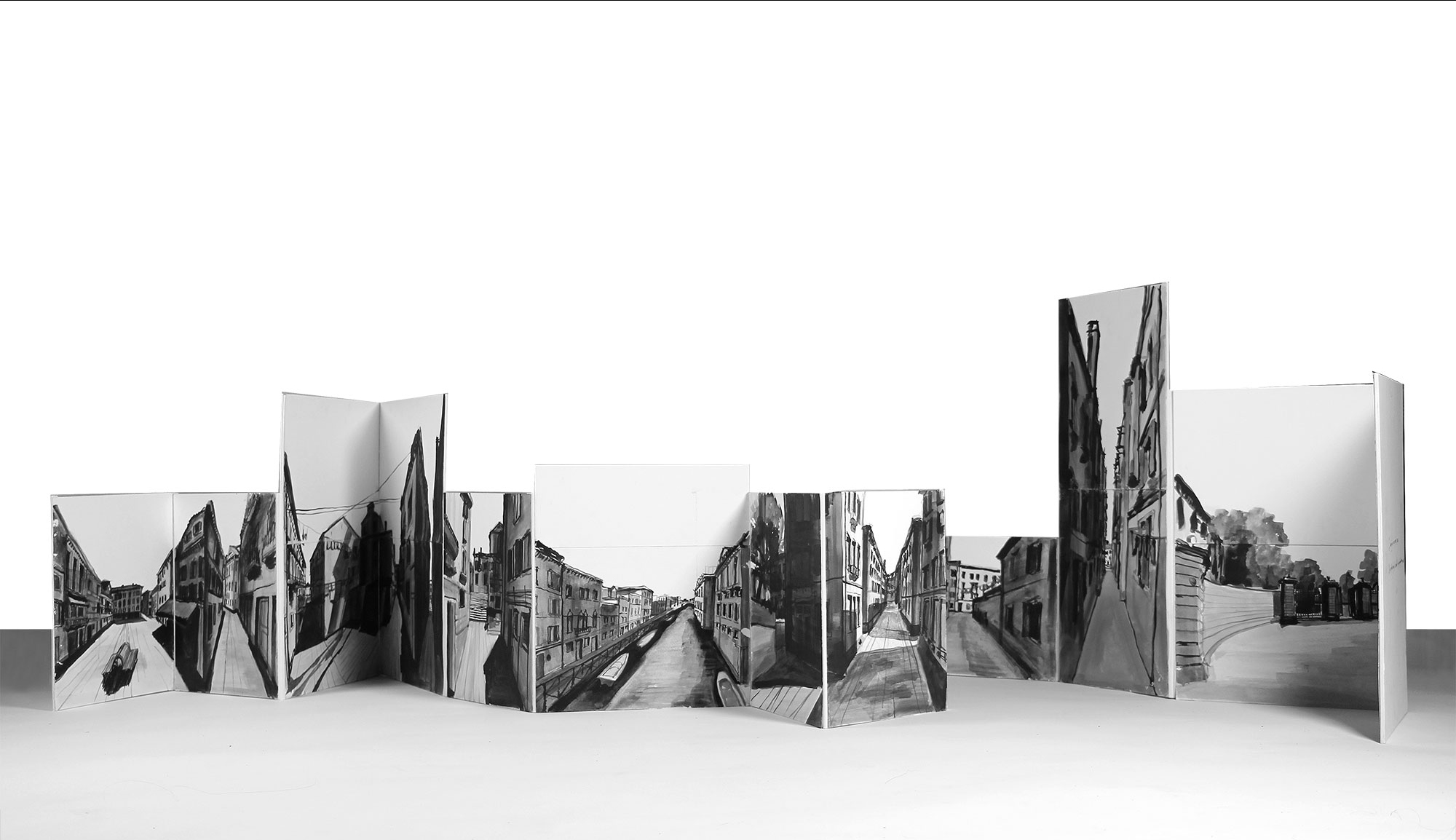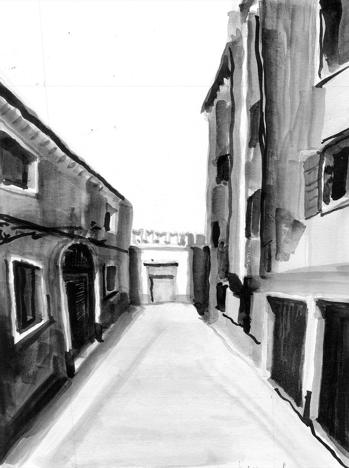 The site documentation of Library in the Labyrinth, these perspective ink paintings portray three linear sequences of wandering through the fabric of Venice and become the subject of A Model of Paintings. The three pathways start in disparate neighborhoods, but ultimately all converge on one site. A fourth pathway starts at the site and proceeds along the park toward the water, out of the maze. There are no perspectives for this pathway, yet.